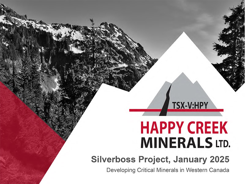 Happy Creek Minerals Ltd. is focussed on making new, 100% owned discoveries in proximity to mines and infrastructure and adding value to the Company for its shareholders. Management, the Board of Directors and Technical Advisors have solid expertise and depth in the mineral resource sector and capital markets.