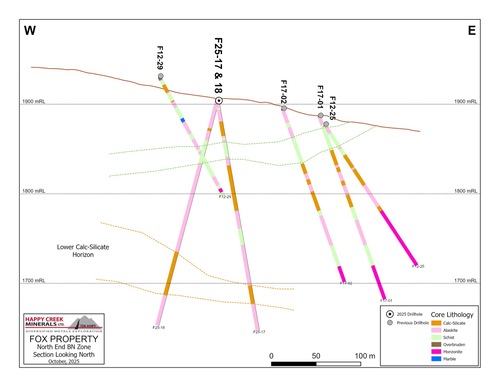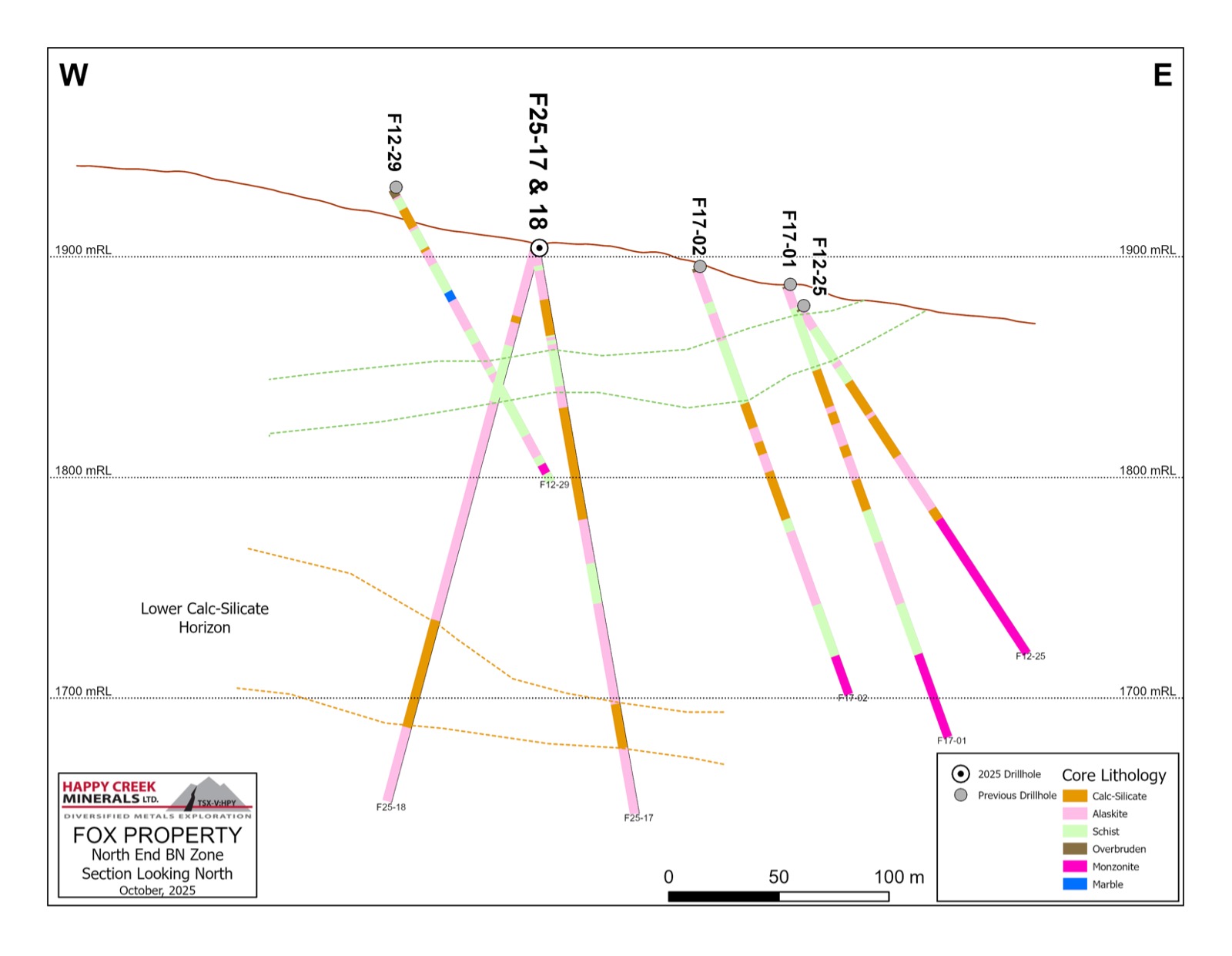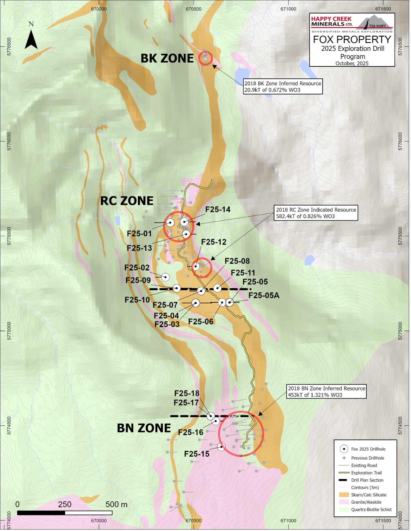 During the period from September 5 to October 5, 2025, Happy Creek completed 18 NQ diameter diamond core drill holes (total 2,175.5 metres) at the Fox tungsten Project focused on resource expansion at the RC and BN zones (See Figure 1 and Table 1 for details).