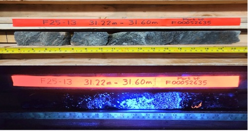 Photo 1 A/B: Drillhole F25 – 13, BN Zone Calc Silicate Horizon at 31 metre depth showing cut core with and without UV lighting indicating the presence of scheelite mineralization