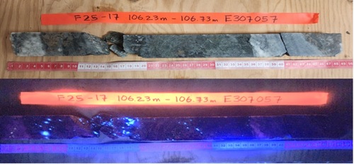 Photo 2 A/B: Drillhole F25 – 17, BN Zone Calc Silicate Horizon at 106 metre depth showing cut core with and without UV lighting indicating the presence of scheelite mineralization