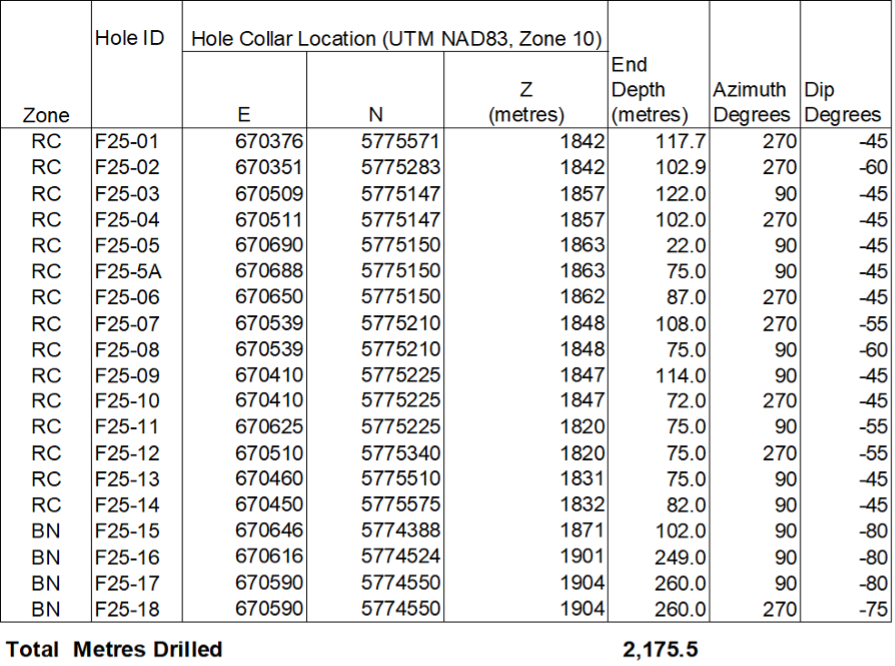 A total of four diamond core drillholes (F25-15, F25-16, F25-17, F25-18) were completed at the BN zone during the 2025 field season for a total of 871.0 metres drilled and an average hole depth of approximately 218 metres (See Table 1).