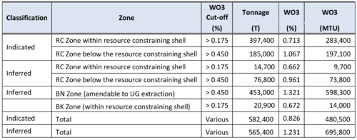 In 2018, Happy Creek published a NI43-101 Resource Estimate for the Fox Tungsten Project. The resource estimate included an Indicated Resource of 582,400 tonnes at 0.826% WO3, all located within the RC Zone. The 2018 NI43-101 Resource Estimate also included an Inferred Resource of 565,400 tonnes at 1.231% WO3 located predominately at the BN Zone (453,000 @ 1.321 WO3). (See Happy Creek news release dated February 27, 2018 for full details, reference NI 43-101 Resource Update, Desautels and Berndt, April 9, 2018).